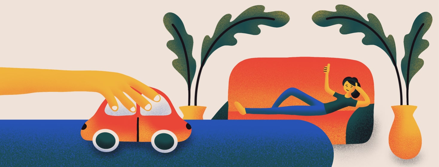 A child's hand plays with a toy car while the mom is sitting on the couch holding her head and giving them a thumbs up.